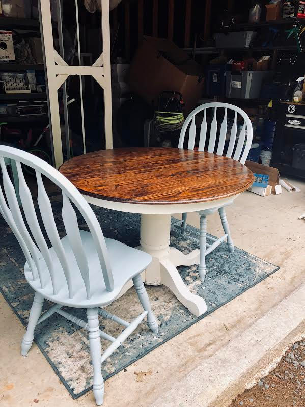 The table was in pretty good shape but had a few spots on the top that needed to be touched up. I always use my hand sander to remove the finish on tables like these because I like to restain the top. I used a chalk paint to paint the base of the table a creamy white color. I like the chalk paint called Dixie Bell from a local marketplace a few stores down from the store where my booth is. Its priced well and love the color selections.